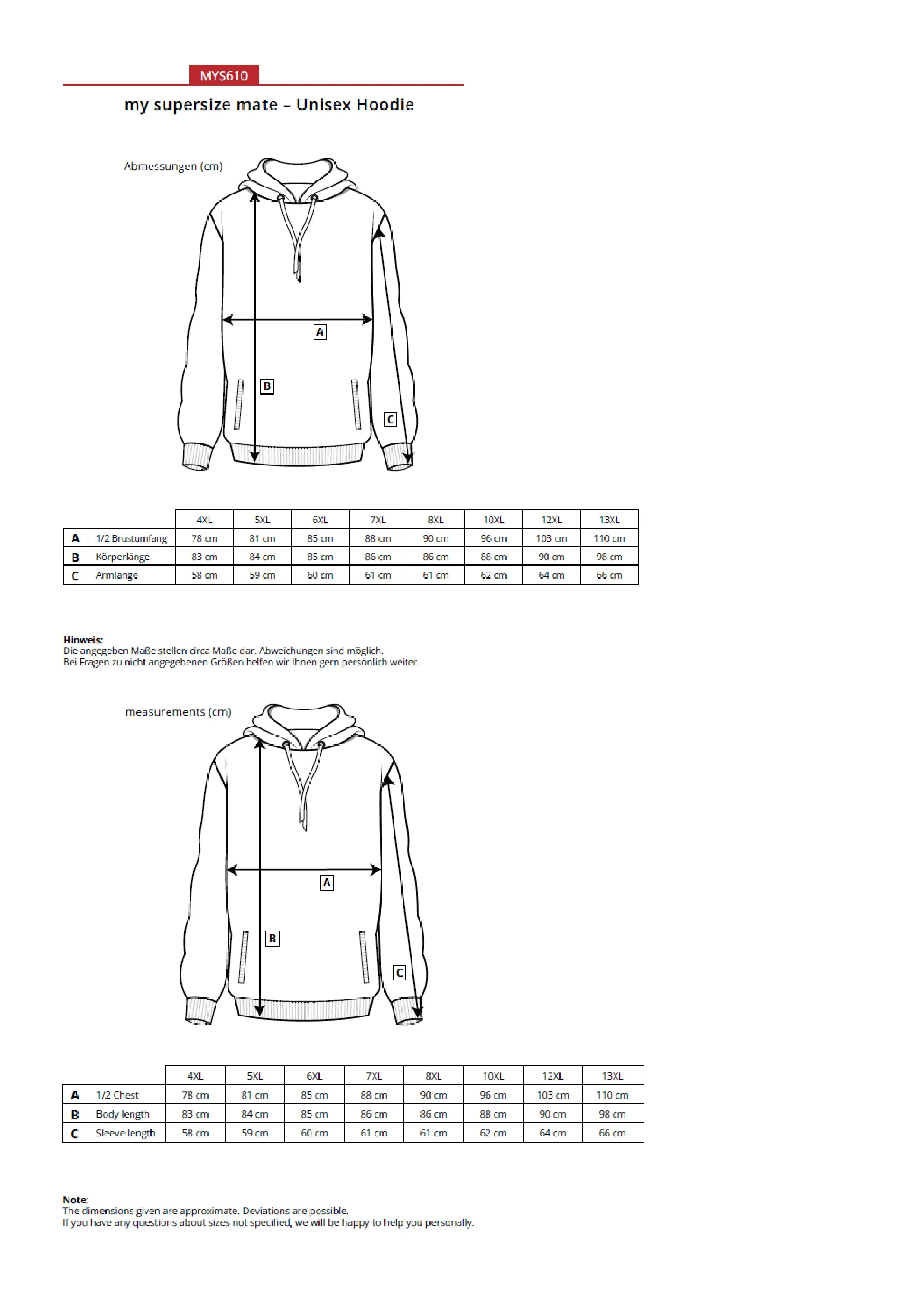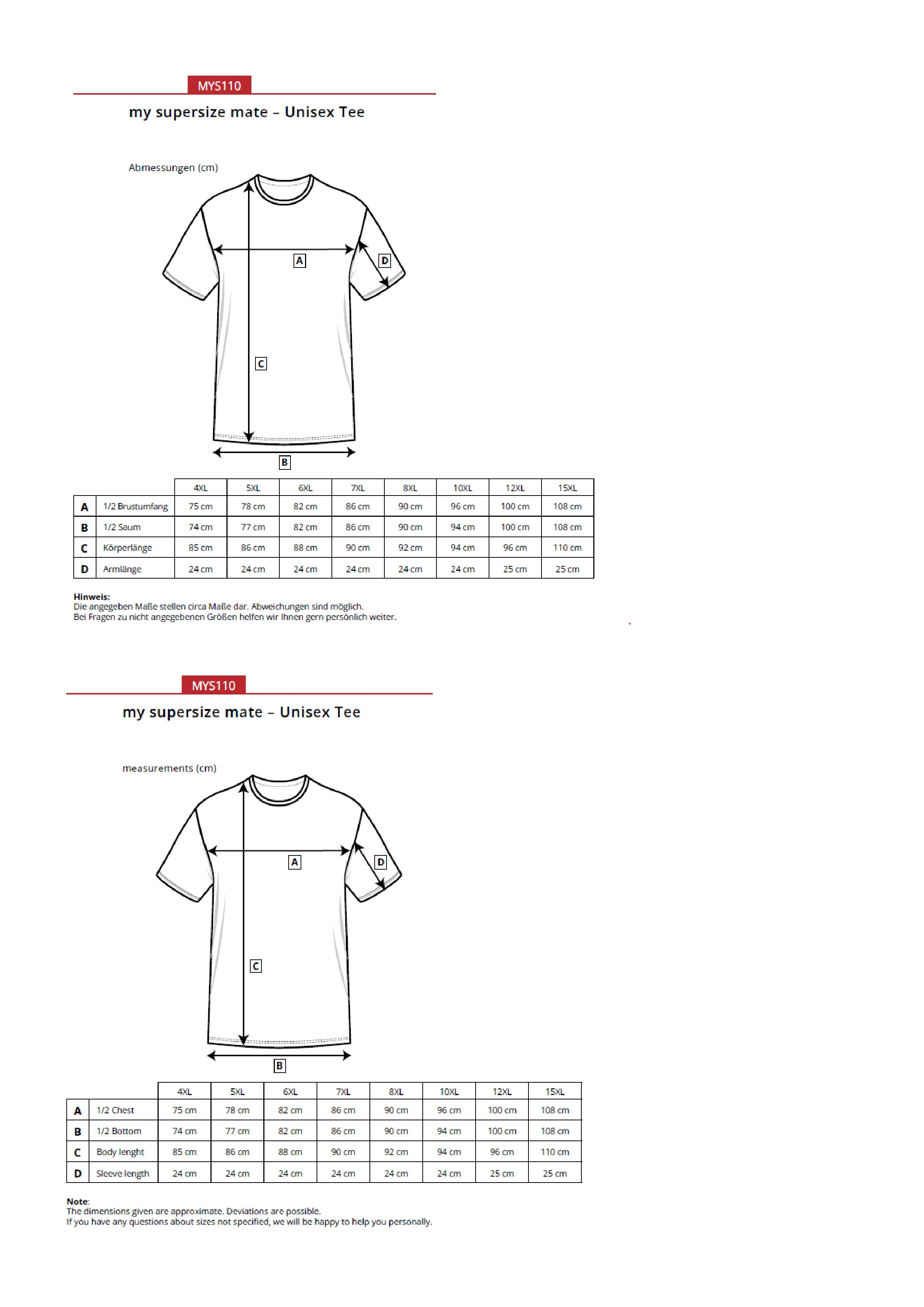 • A – chest: measured roughly 2.5 cm below the armpits over the breadth of the (flattend) torso.
